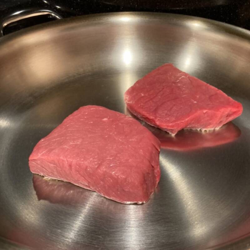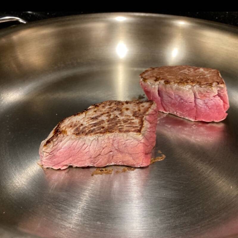 I like to eat my steak bleu/rare and for the best result I use a steelpan from Demeyere. This pan is amazing!! Baking goes so fast, you bake the lamb without fat and as soon as the meat is seared, it releases itself from the pan and you can flip the meat.
